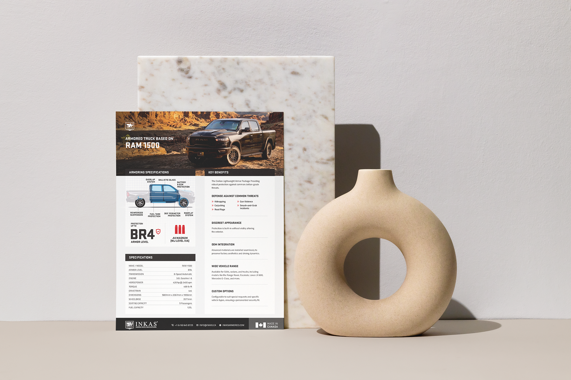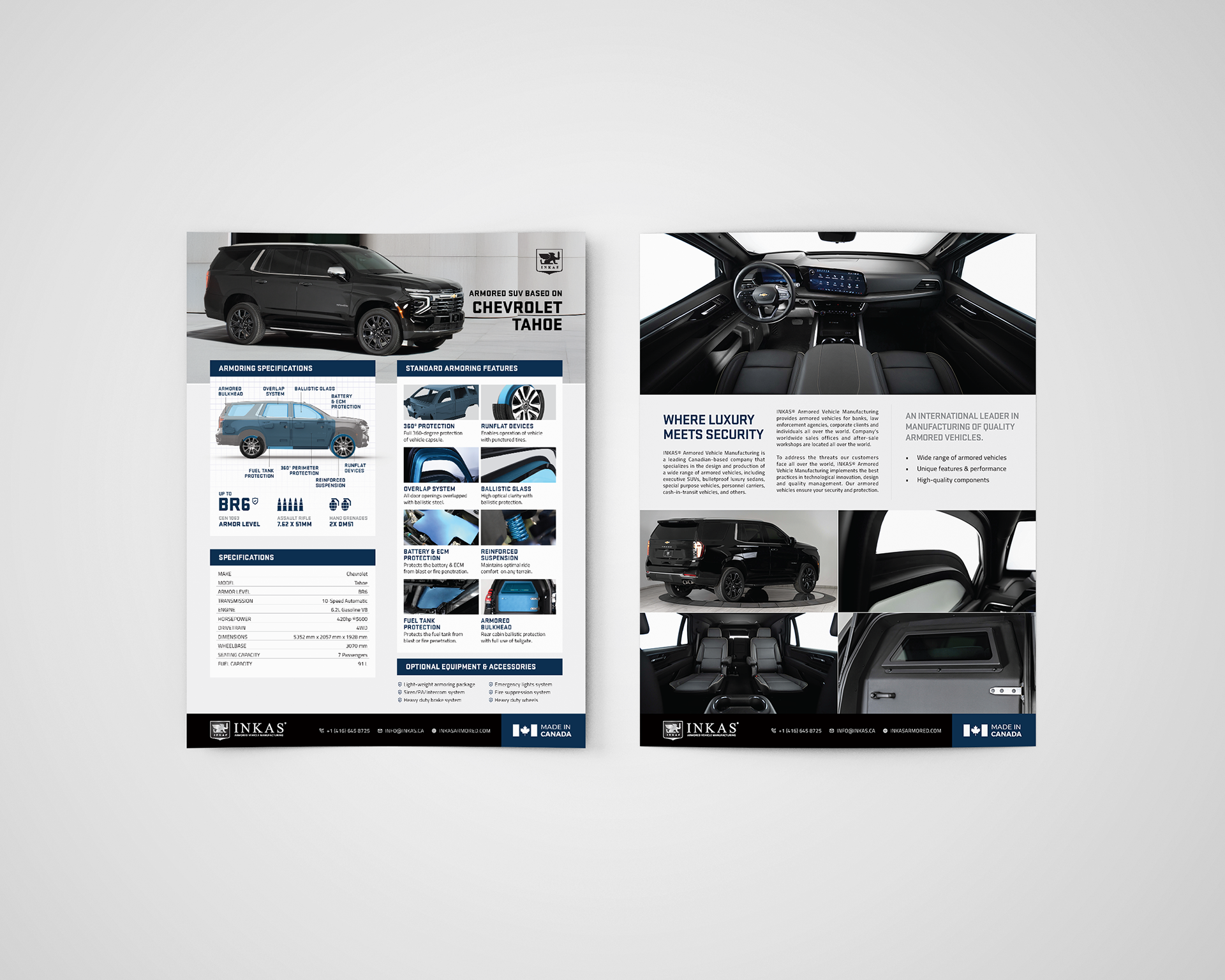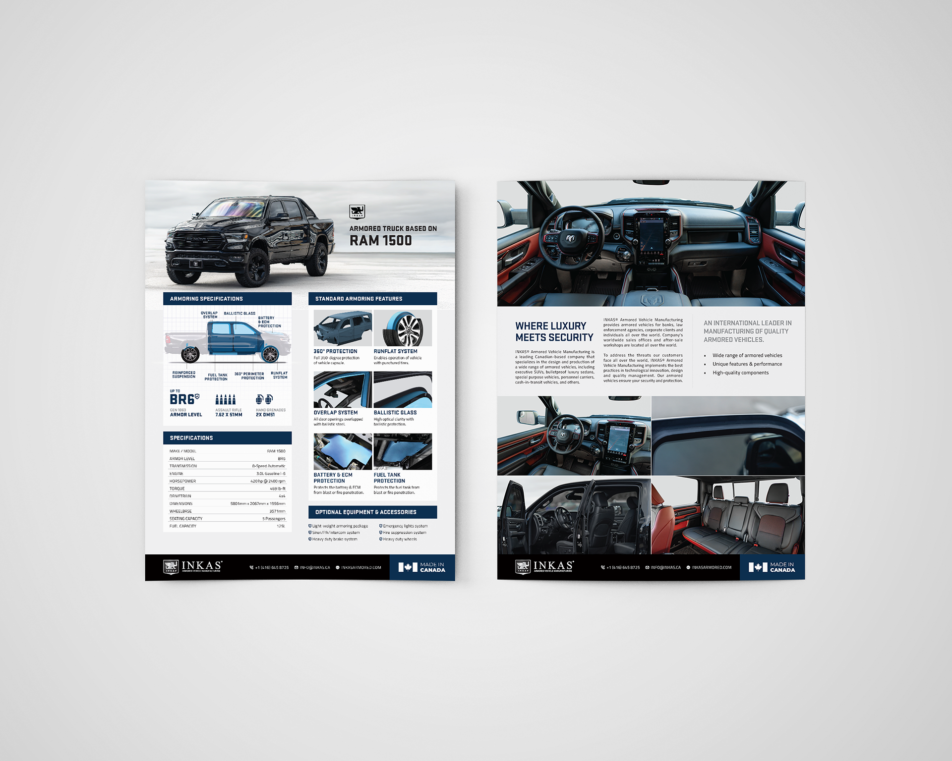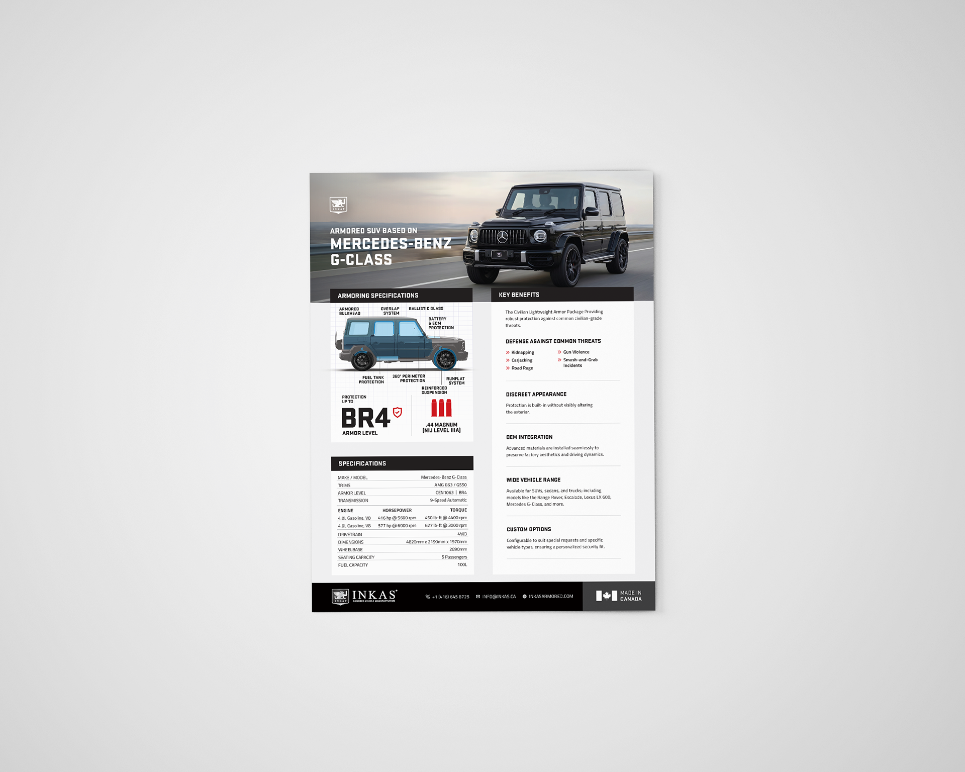 Technical Data Visualization: Strategic information architecture applied to 20+ vehicle flyers, transforming complex armoring specs into intuitive infographics.