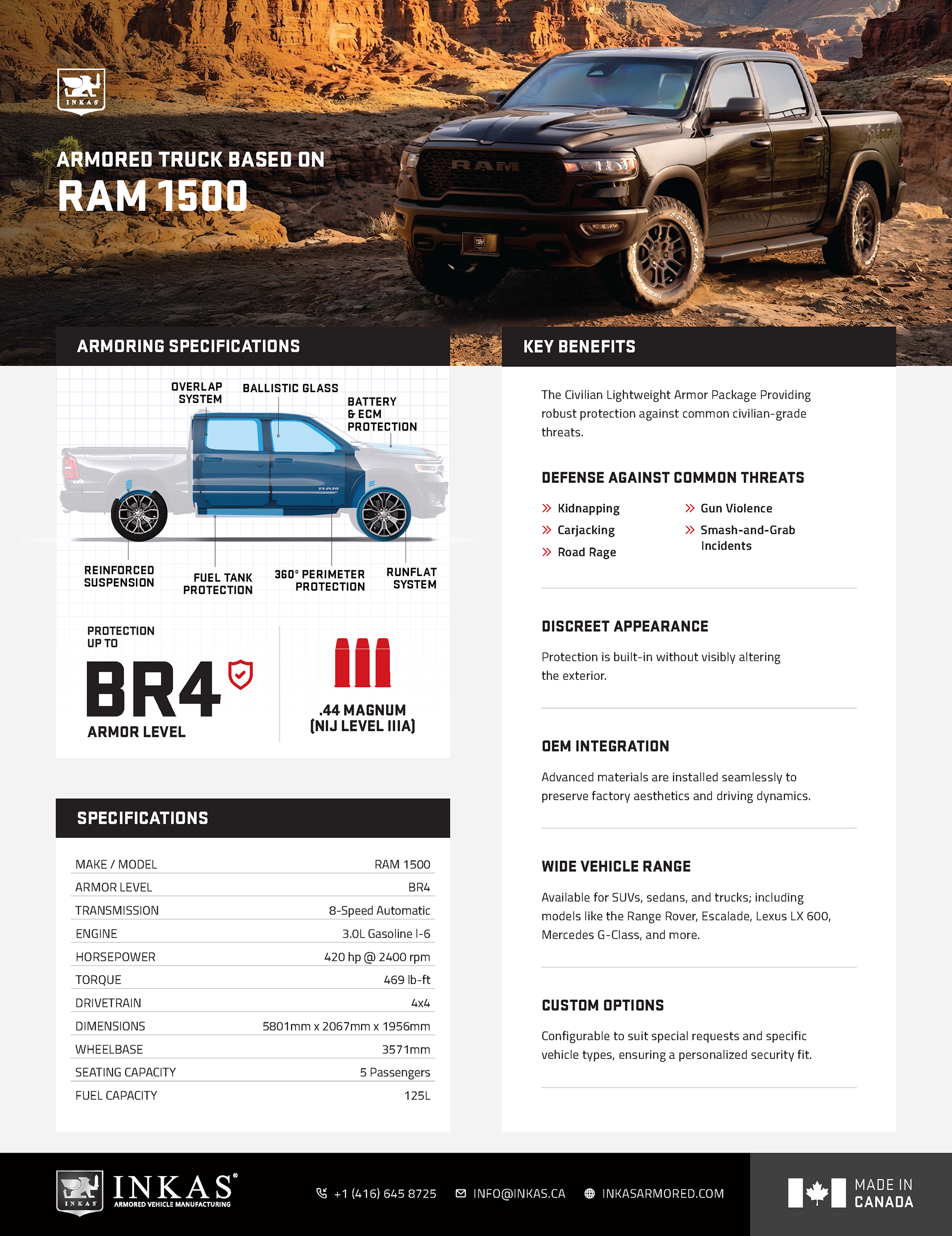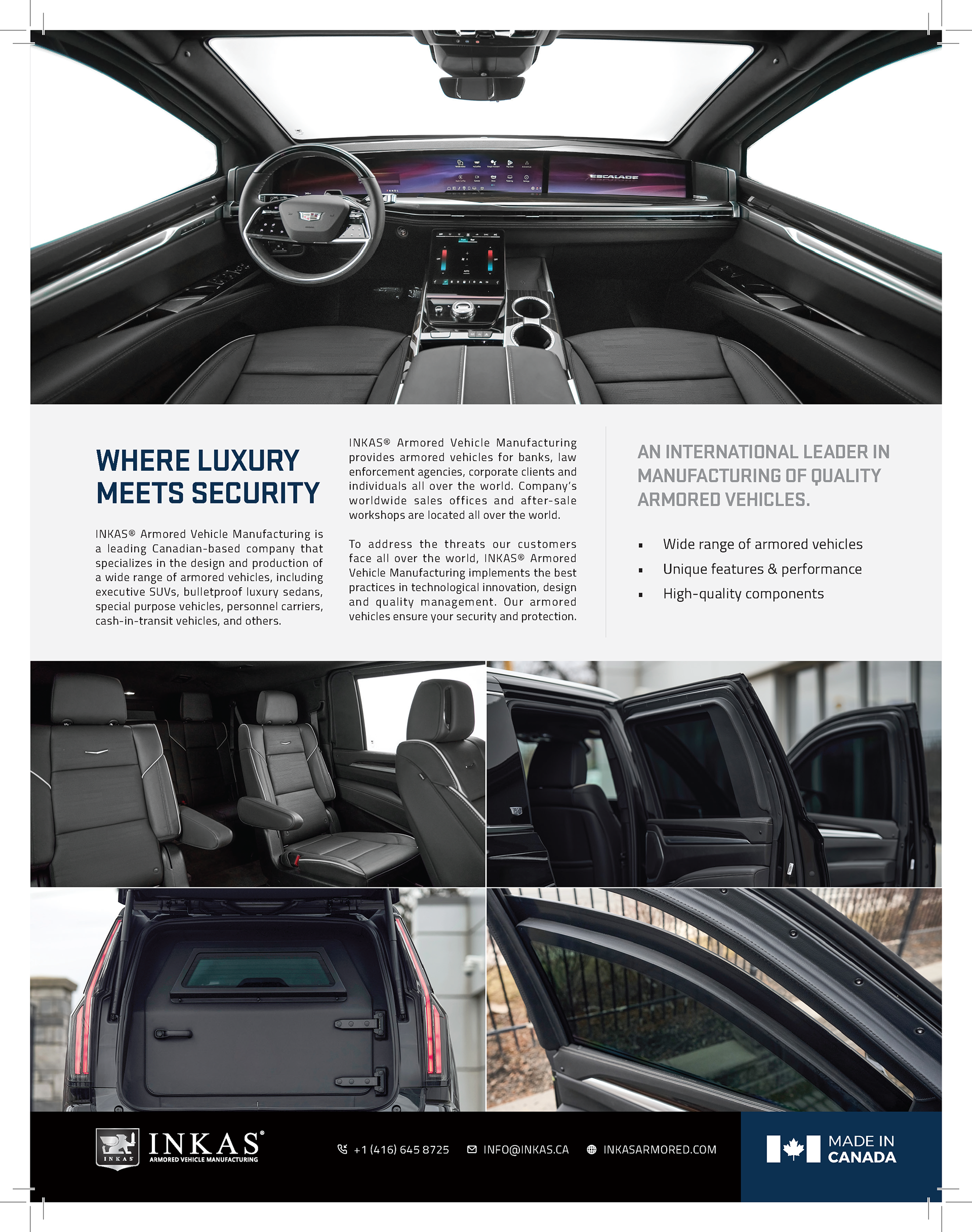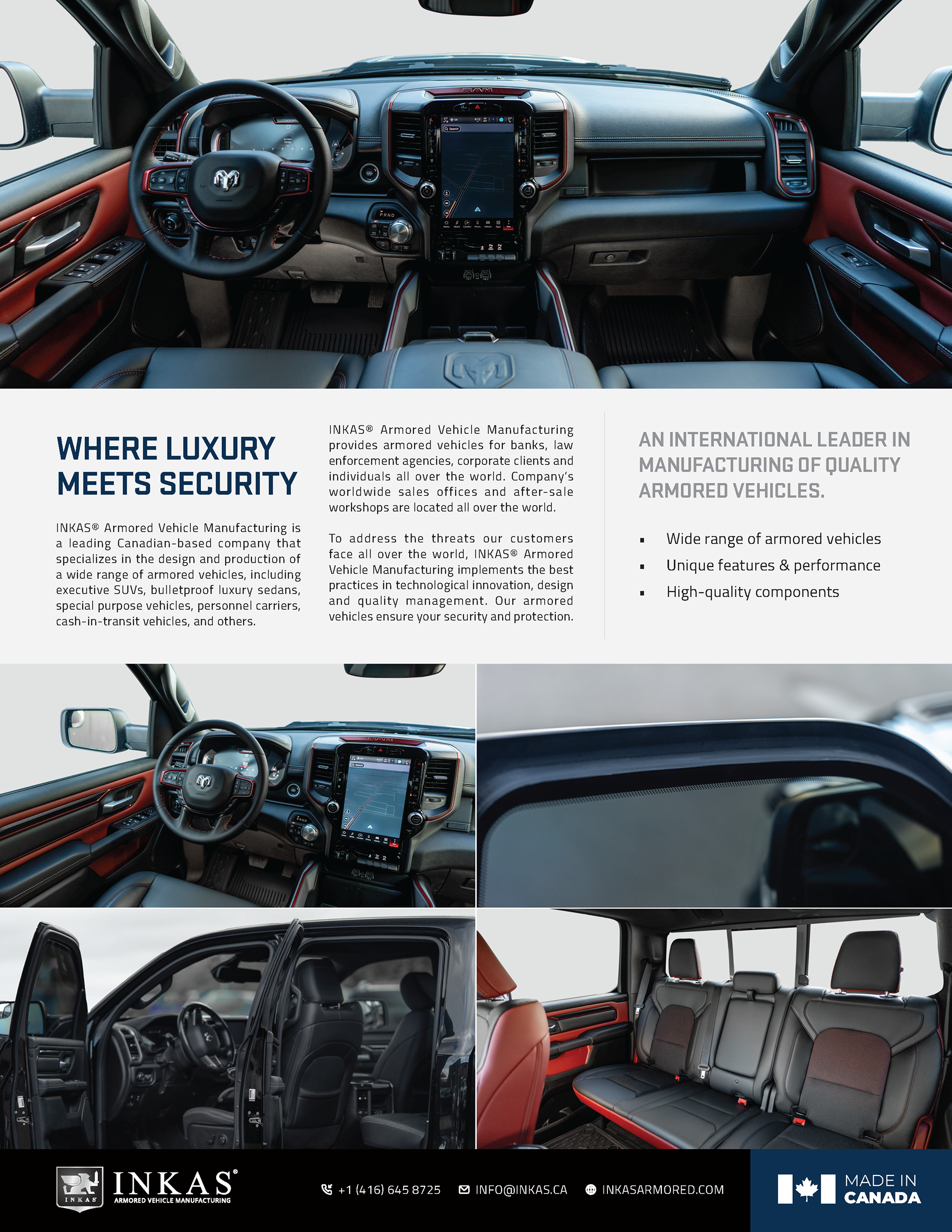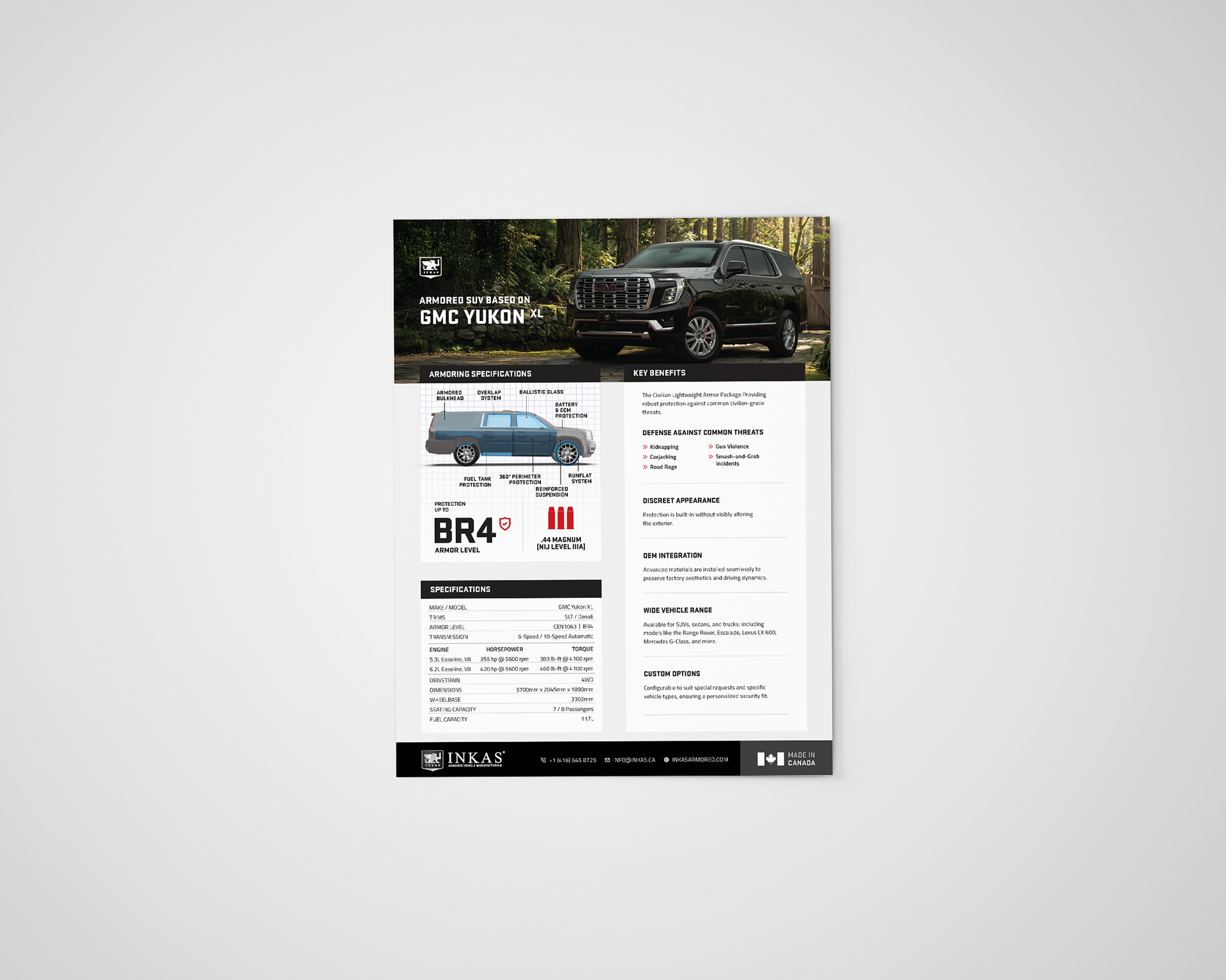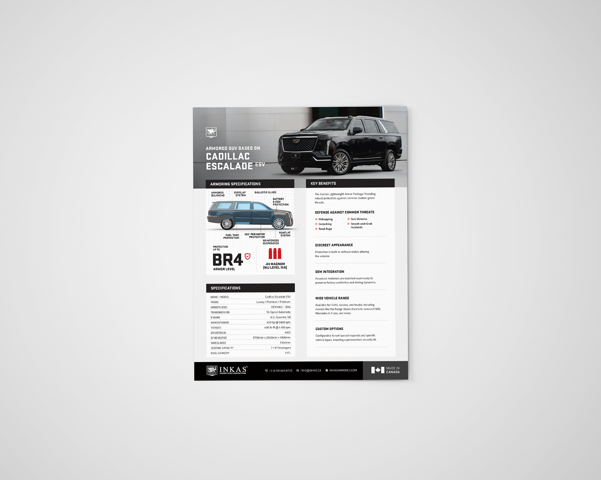 Technical Data Visualization: Strategic information architecture applied to 20+ vehicle flyers, transforming complex armoring specs into intuitive infographics.